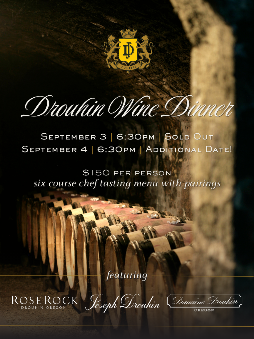 We’re thrilled to welcome Mark Kalachnik of Dreyfus, Ashby & Co. for a special wine dinner featuring the acclaimed wines of Maison Joseph Drouhin. Discover the elegance of Burgundy alongside exceptional Pinot Noir and Chardonnay from their Oregon estate vineyards—Domaine Drouhin and Roserock.